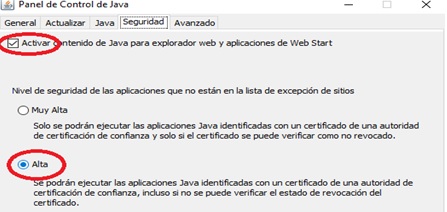 6. Ir a la pestaña Seguridad, activar la opción “Activar Contenido de Java para explorador Web….”; en nivel de seguridad hacer clic en “Alta”.