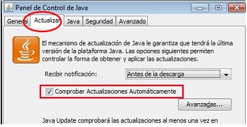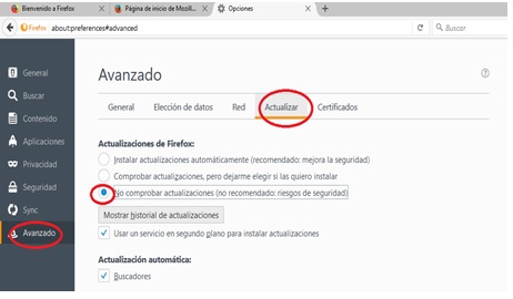 9. Hacer clic en la pestaña Actualizar. Desactivar la opción “Comprobar Actualizaciones Automáticamente”, en el mensaje de advertencia indicar “No comprobar”; hacer clic en aplicar y aceptar.
