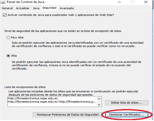 10. En la pestaña Seguridad, en la parte inferior derecha hacer clic en el botón “Gestionar Certificados”.