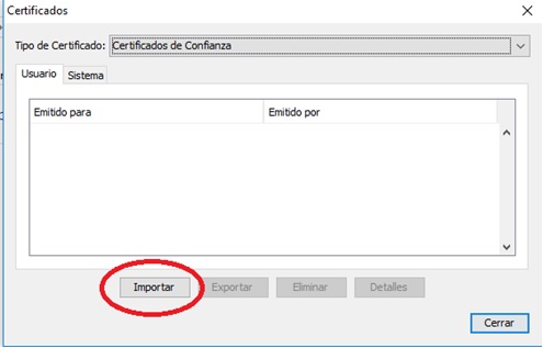 11. En la opción tipo de certificado escoger “Certificados de Confianza”, hacer clic en el botón Importar; ubicar el archivo de la firma electrónica, el cual debe ser guardado en la computadora; hacer clic en Cerrar.