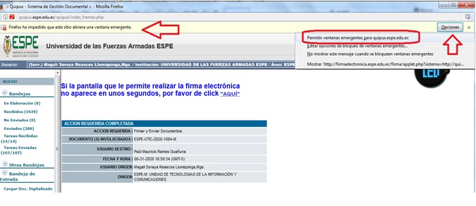 5. A continuación en la siguiente pantalla hacer clic en Opciones y escoger la Opción “ Permitir ventanas emergentes para quipux.espe.edu.ec