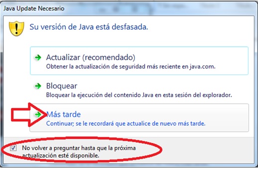 8. Escoger la opción de “No volver a preguntar hasta que la próxima actualización esté disponible” y hacer clic en “Más Tarde”.