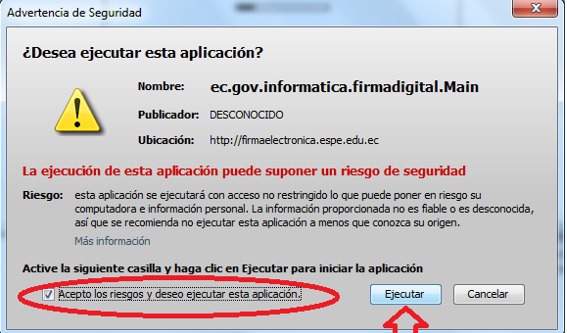 9. Escoger la opción “Acepto los riesgos y deseo ejecutar esta aplicación” y hacer clic en el botón