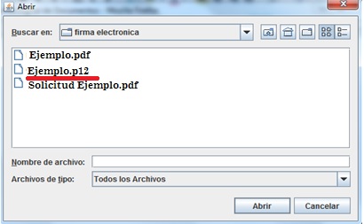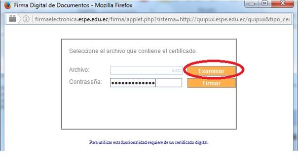 10. Hacer clic en “Examinar” y seleccionar el archivo que contiene el certificado – firma electrónica que fue copiado en el computador.