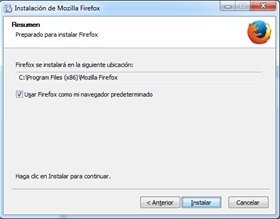 9. En la siguiente pantalla escoger la opción “Usar Firefox como mi navegador predeterminado” y hacer clic en Instalar.