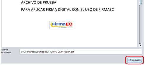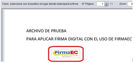 7. A continuación en la siguiente ventana se visualiza el contenido del documento PDF, ubicar el sello de FirmaEc en el lugar donde se va a estampar la firma electrónica.