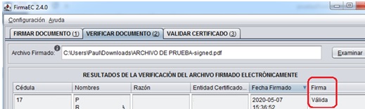 3. Luego el sistema valida y muestra el resultado en el campo Firma como “Válida”.