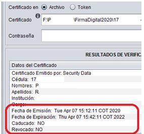 3. El sistema mostrará la información personal del certificado digital, la fecha de emisión, de expiración, si esta caducado o revocado.